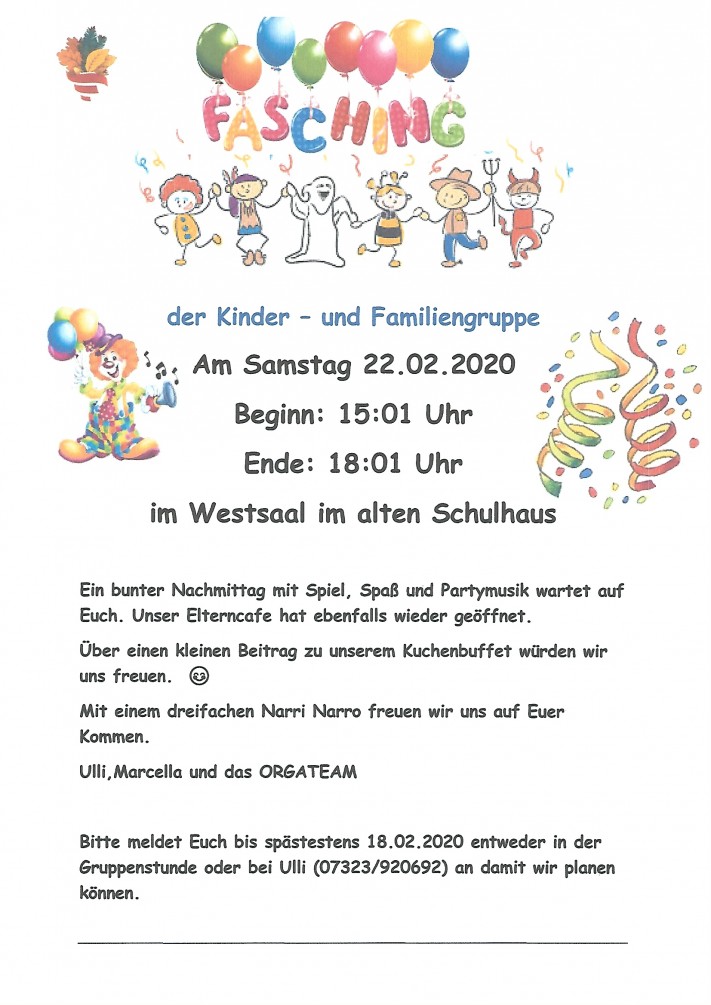 Fasching der Kinder- und Familiengruppe Sa., 22.02.2020, Gerstetten Uhrzeit: 15:01 - 18:01 Ort: Altes Schulhaus Schulstraße Gerstetten iCalendar Mit dem Laden der Karte akzeptieren Sie die Datenschutzerklärung von Google.Mehr erfahren Karte laden Google Maps immer entsperren zur Übersicht