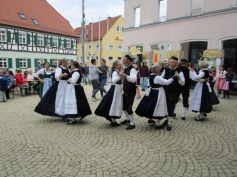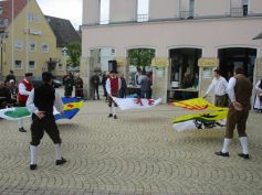 Musik und Tanz sind am 1. Mai wichtige Programmpunkte. Wolfgang Schwarz gab den richtigen Ton und Takt vor und begleitete die Sänger mit seiner Gitarre. Maren und Anna Schneider (Querflöte und Gesang) sowie Anke Hinderer (Blockflöte) standen ihm zur Seite. Die aktive Volkstanzgruppe wurde unter der Leitung von Günther Schneider und Dagmar Schlumpberger von zwei Paaren aus Nattheim und den jungen Volkstänzern aus Gerstetten unterstützt. Ulrike Jooß ist für den Nachwuchs zuständig und führte auch humorvoll und informierend durch das Programm. Gleich zu Beginn wurden die Tänze „Sternpolka“, „Holsteiner Dreitour“ und „Zigeunerpolka“ der Erwachsenen mit begeistertem Sonderapplaus bedacht. Doch wahres Entzücken riefen die 3 bis 6-Jährigen hervor, als es hieß: „Auf die Plätze – Tschu – Tschu – Wah!“ Nachdem sich die Kinder zuvor am Schminktisch geduldig in Prinzessinnen, Löwen und allerlei Fabelwesen hatten verwandeln lassen, spielten sie tanzend auf dem Marktplatzpflaster ihr Temperament aus. Dazwischen gab es Mittagessen: Maultaschen und Kartoffelsalat, Weißwurst und Brezel, köstliche Pfannkuchen mit feiner Erdbeermarmelade aus neuester Ernte oder auch mit Nutella. Am Nachmittag wurde ein besonderes Schauspiel geboten: Fünf Fahnenschwinger aus dem Donau-Brenz-Gau ließen zu Trommelschlägen und Flötenklängen mit kraftvollen, eleganten Bewegungen ihre bunten Fahnen tanzen. Eine beeindruckende Vorstellung.