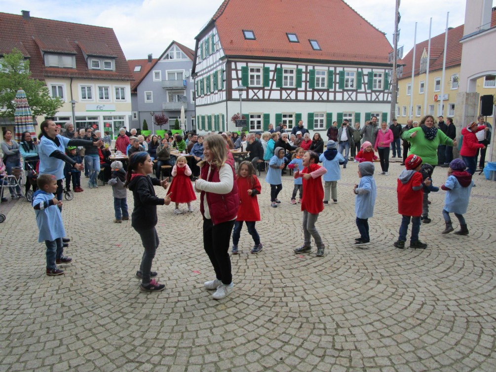 Zwischendurch zeigten die Tänzer noch mehrmals ihr Können, Wolfgang Schwarz stimmte das nächste Lied an und das Dampfzügle fuhr fauchend und zischend seine Fahrgäste übers Pflaster. In der Luft lag Kaffeeduft, das Kuchenbuffet ließ keine Wünsche offen, die Kleinen hüpften vergnügt auf dem Marktplatz herum und den „Großen“ an den Tischen ging der Gesprächsstoff nicht aus. Sogar die Maiensonne ließ sich noch blicken. Kurz und gut: Ein schöner, unterhaltsamer Nachmittag an diesem 1. Mai. Alle Vögel waren da, alle Vögel alle! (ly)