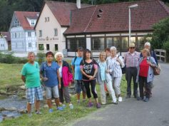 16 Wanderer fanden sich am Mittwoch, 15.08.2018, am Seeplatz ein, um nach Urspring zu fahren. Vom Parkplatz am Kinderhaus führte unsere Rundwanderung an der 1860 erbauten evangelischen Johannes-Kirche vorbei durch die Bahnunterführung nach Lonsee. Wir wanderten neben der Bahnlinie durch die sommerliche Heidelandschaft bis zum Bahnhof. Schlehenhecken mit unzähligen, schon tiefblauen Früchten säumten unseren Weg, und rechts brausten immer wieder Güterzüge, Regiozüge und sogar ein ICE auf der Strecke Ulm – Stuttgart an uns vorbei. In Lonsee überquerten wir die Bahnschienen auf der Fußgängerbrücke und wanderten an der Lone entlang wieder nach Urspring zurück. Kurz vor dem Quelltopf trafen wir auf eine Wassertretanlage im eiskalten Flüßchen, die zwei ganz Mutige zur Abkühlung nutzten. Dann waren wir am Ziel. Urspring hat ca. 860 Einwohner und gehört mit 5 weiteren Ortsteilen zur Gemeinde Lonsee (insgesamt ca. 4900 Ew.). Der Name Urspring bedeutet „Siedlung an der Quelle“. Der Quelltopf hat einen Durchmesser von 10 Metern und ist 6 Meter tief. Himmel, Bäume, Häuser und unsere Wandergruppe spiegelten sich im blau-grünen Wasser und ergaben ein malerisches Bild, das uns stark an den Blautopf in Blaubeuren erinnerte. Als ein schmales, klares Bächlein beginnt die Lone in Urspring ihren 38 km langen Weg bis zu ihrer Mündung in die Hürbe bei Hürben. Von dort fließt sie in die Brenz und weiter in die Donau. Nach der gemütlichen Einkehr in der Speisegaststätte „Halde“ besuchten wir die ganz in der Nähe liegende Haldensteinhöhle, in der man laut einer angebrachten Tafel u. a. zwei Blattspitzen aus Bohnerz und eine große Klinge aus der Zeit der Neandertaler sowie Reste von verschiedenen Tieren gefunden hat. Drei waghalsige „Bergsteiger“ erklommen den schwer zugänglichen Höhleneingang, der aber leider verschlossen war. Nach wenigen Minuten erreichten wir wieder unseren Parkplatz und traten gut gelaunt die Heimfahrt an. (HL)