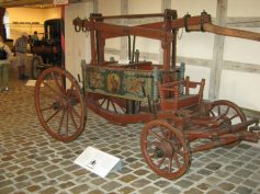 Nach vierjähriger Sanierung mit einem Kostenaufwand von 4,6 Millionen DM beherbergt das Gebäude seit 1987 ein inzwischen preisgekröntes Museum. Es bietet auf 3 Stockwerken einen Überblick über Fahrzeugtypen und Verkehrsentwicklung vom 18. Jahrhundert bis in die Gegenwart. Schon im Erdgeschoss beginnt das Staunen, denn unter anderen Raritäten ist das älteste Taxi der Welt zu sehen (Baujahr 1898, Höchstgeschwindigkeit 25 km), ferner eine Feuerspritze von 1720 aus Balingen (siehe Foto), ein Postschlitten der Königlich Württ. Post, der in den 1850er-Jahren zwischen Stetten und Messkirch verkehrte. Nicht zu vergessen sei das noble „Reise-Cabriolet“, mit dem 1810/1820 in Samt, Leder und Brokat Reisen z. B. nach Köln und Paris unternommen wurden. Als wir uns durch die weiteren Stockwerke emporgearbeitet hatten, reichte die Zeit gerade noch zu einem Blick in die Schlosskirche, wo unter dem Thema „Kirchenkunst im Kirchenraum“ Skulpturen und Ölgemälde verschiedener Epochen z. B. aus Spanien, Italien, Österreich und Süddeutschland zu bewundern sind. Auf einem kleinen Rundgang besuchten wir noch das „Brunnengärtle“ mit dem kunstvollen schmiedeeisernen „Kindlesbrunnen“, denn in Heidenheim wurden die Babys früher nicht wie andernorts vom Storch gebracht, sondern aus diesem Brunnen geholt! Wir durchquerten den Rittersaal und genossen von der Schlossmauer die großartige Aussicht auf unsere Kreisstadt und ihre schöne Umgebung.
